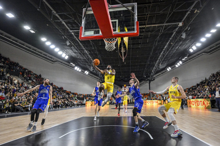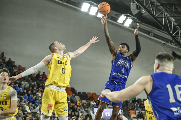Daye Antonio z Inter Bratislava (uprostred) počas 31. kola basketbalového zápasu SBL mužov 2023/2024 medzi Inter Bratislava - Spišskí rytieri (SNV). Bratislava, 16. február 2024. Foto: SITA/Milan Illík