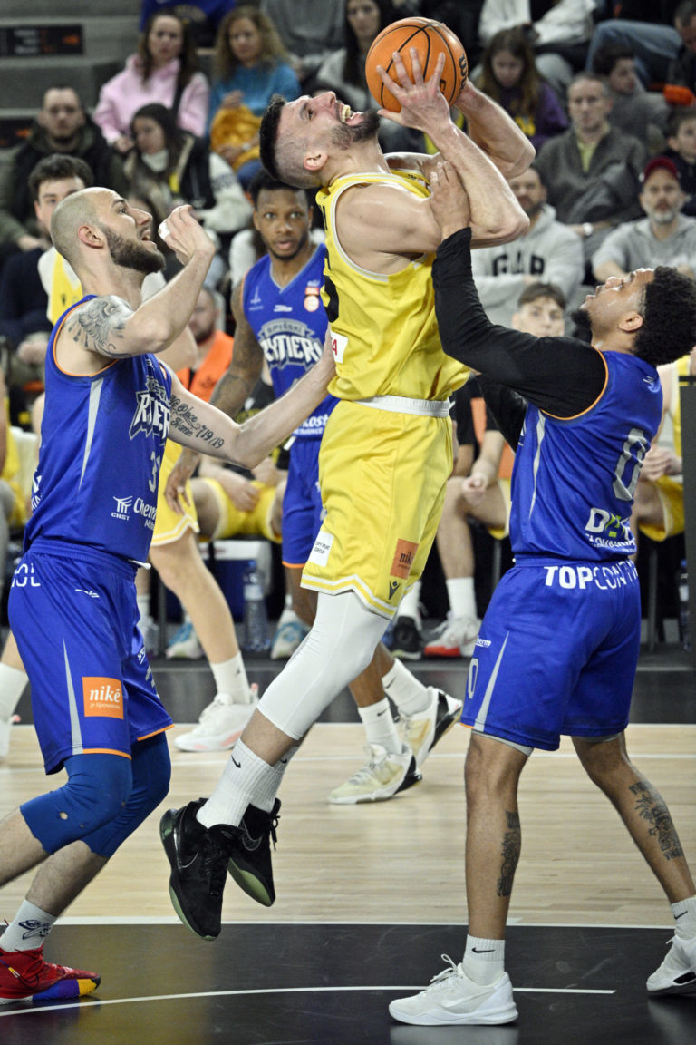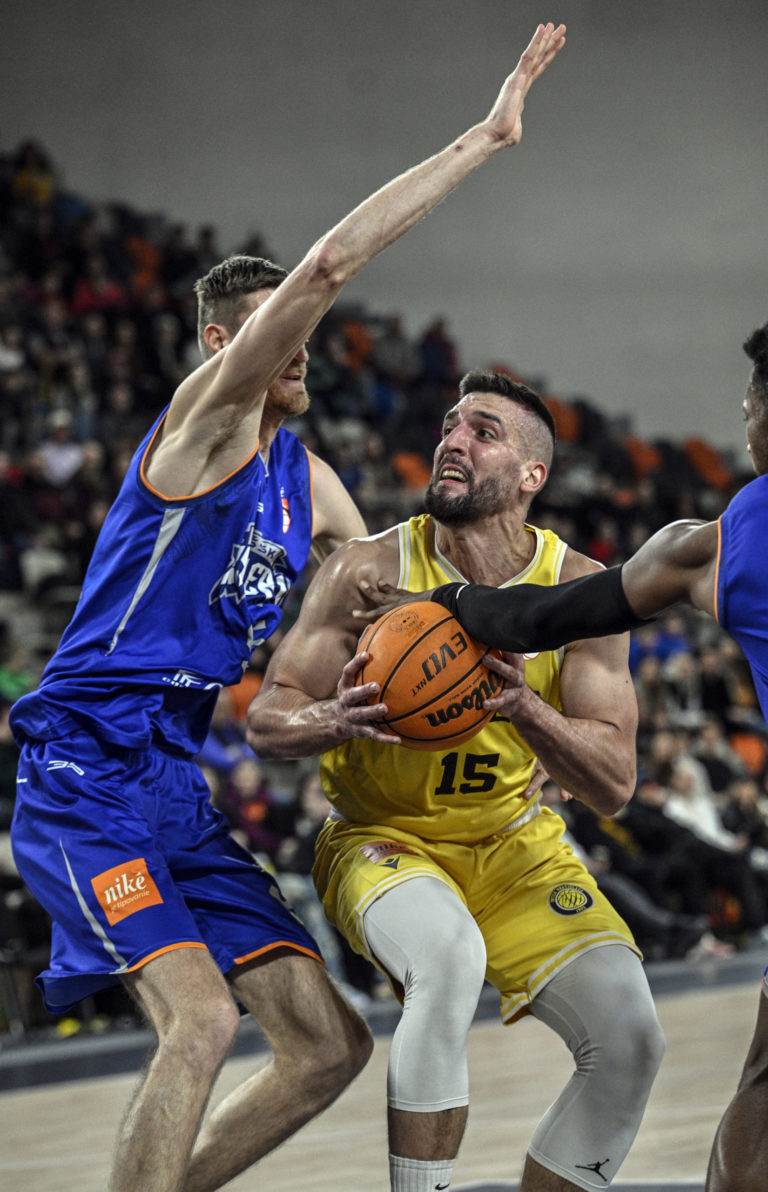 Gojko Sudžum z Inter Bratislava (uprostred) počas 31. kola basketbalového zápasu SBL mužov 2023/2024 medzi Inter Bratislava - Spišskí rytieri (SNV). Bratislava, 16. február 2024. Foto: SITA/Milan Illík