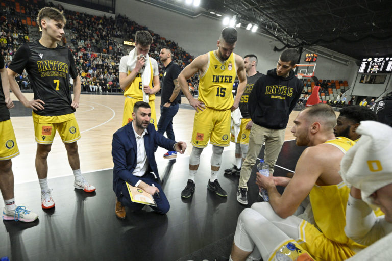 Tréner Danilo Rakočevič z Inter Bratislava (uprostred dolu) počas 31. kola basketbalového zápasu SBL mužov 2023/2024 medzi Inter Bratislava - Spišskí rytieri (SNV). Bratislava, 16. február 2024. Foto: SITA/Milan Illík