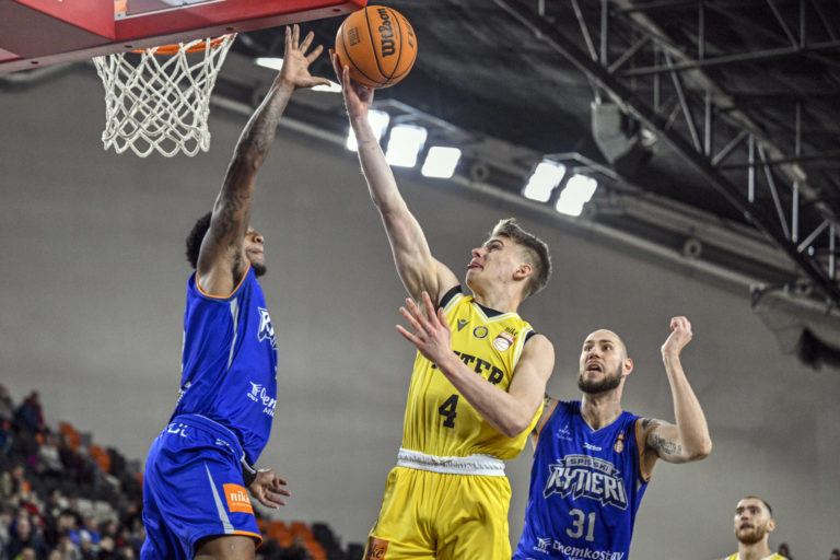 Viktor Juríček z Spišskí rytieri(vľavo) počas 31. kola basketbalového zápasu SBL mužov 2023/2024 medzi Inter Bratislava - Spišskí rytieri (SNV). Bratislava, 16. február 2024. Foto: SITA/Milan Illík
