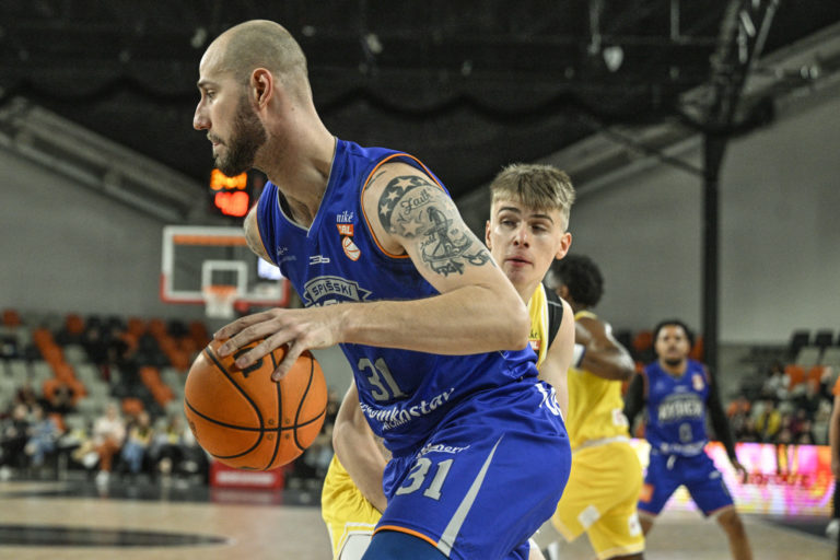 Gojko Sudžum z Inter Bratislava (vpravo) počas 31. kola basketbalového zápasu SBL mužov 2023/2024 medzi Inter Bratislava - Spišskí rytieri (SNV). Bratislava, 16. február 2024. Foto: SITA/Milan Illík
