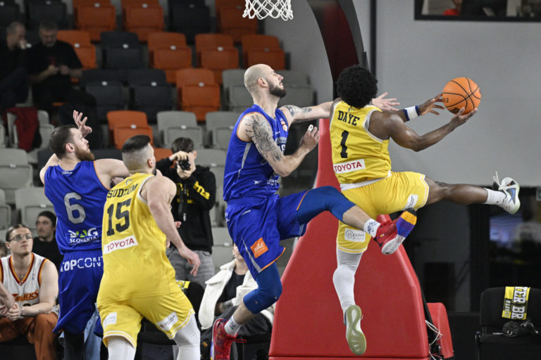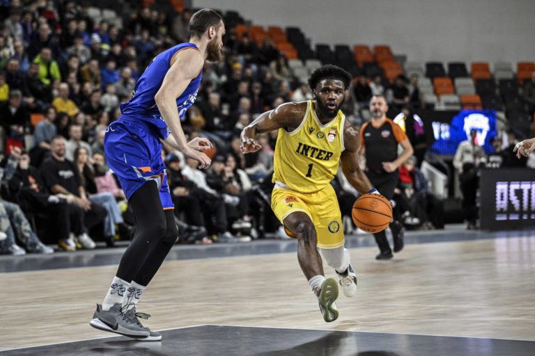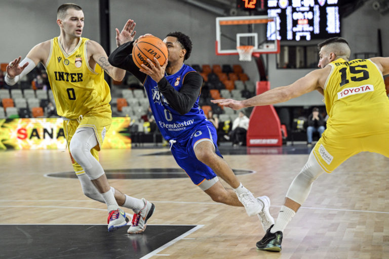 Antonio Daye z Inter Bratislava (vpravo) počas 31. kola basketbalového zápasu SBL mužov 2023/2024 medzi Inter Bratislava - Spišskí rytieri (SNV). Bratislava, 16. február 2024. Foto: SITA/Milan Illík