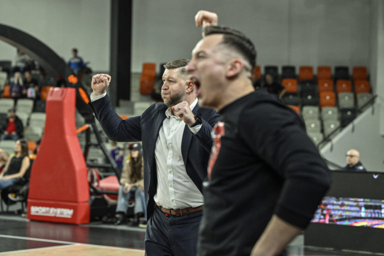 Tréner Teo Hojč z Spišskí rytieri (vľavo) počas 31. kola basketbalového zápasu SBL mužov 2023/2024 medzi Inter Bratislava - Spišskí rytieri (SNV). Bratislava, 16. február 2024. Foto: SITA/Milan Illík