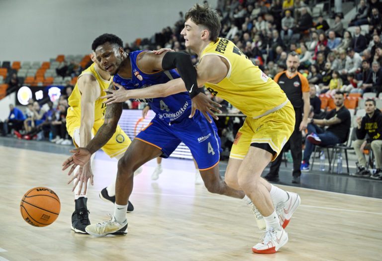 Zľava uprostred: Ozrem Pavlovič z Inter Bratislava a Cory Reeves z Spišskí rytieri počas 31. kola basketbalového zápasu SBL mužov 2023/2024 medzi Inter Bratislava - Spišskí rytieri (SNV). Bratislava, 16. február 2024. Foto: SITA/Milan Illík