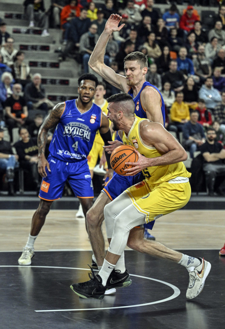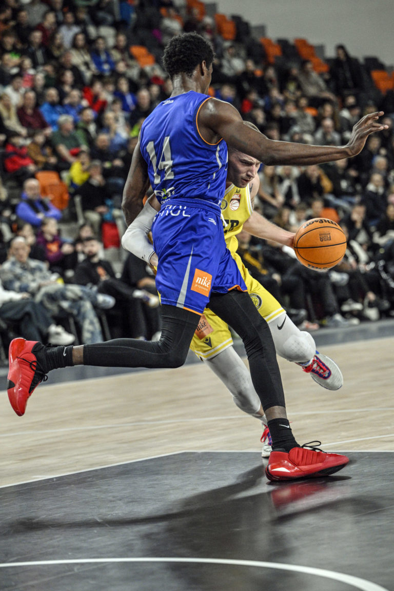 Gojko Sudžum z Inter Bratislava (v popredí) počas 31. kola basketbalového zápasu SBL mužov 2023/2024 medzi Inter Bratislava - Spišskí rytieri (SNV). Bratislava, 16. február 2024. Foto: SITA/Milan Illík