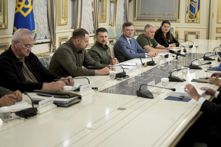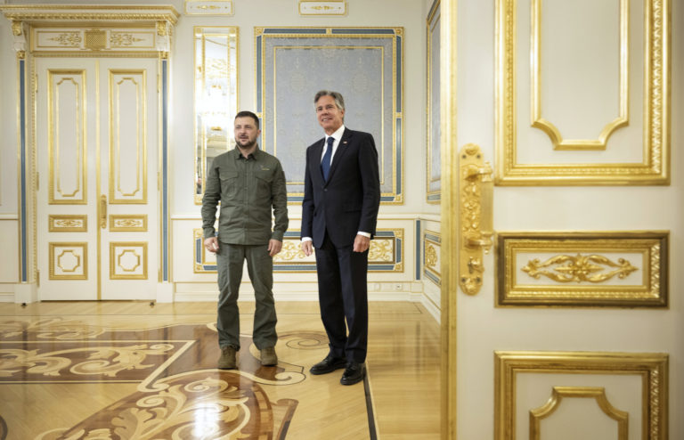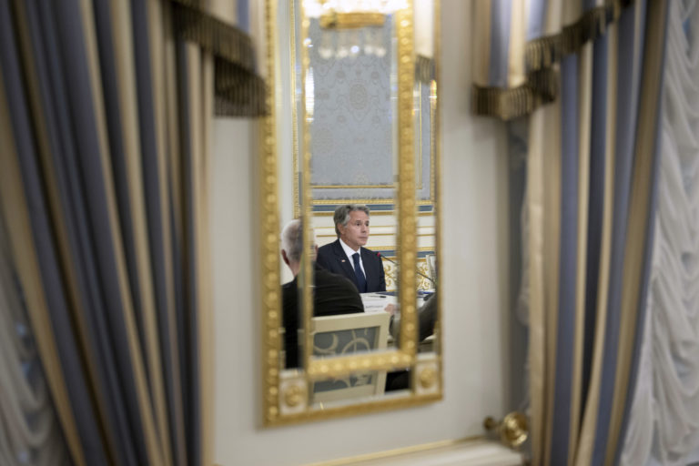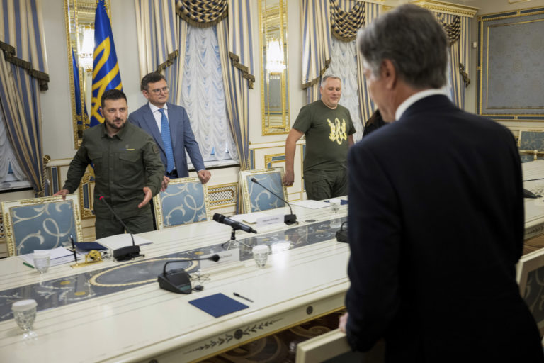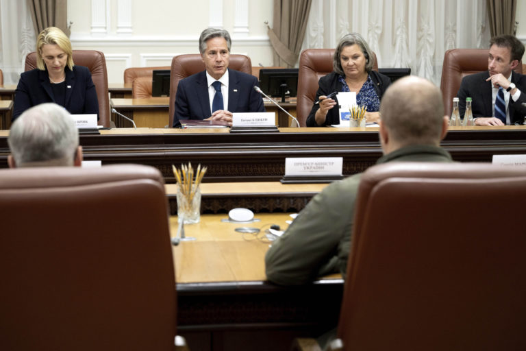 Americký minister zahraničných vecí Antony Blinken (uprostred) po boku veľvyslankyne USA na Ukrajine Bridget Brink (vľavo), úradujúcej námestníčky ministra zahraničných vecí USA Victorie Nulandovej (druhá sprava) a zástupcu vedúceho služobného úradu ministerstva zahraničných vecí USA Toma Sullivana (vpravo) prednáša úvodné vyhlásenie počas stretnutia s ukrajinským premiérom Denysom Šmyhalom (chrbtom ku kamere) v kancelárii premiéra v Kyjeve. Foto: Brendan Smialowski/Pool Photo via AP