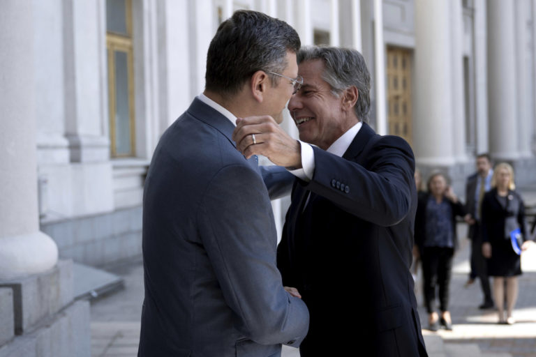 Ukrajinský minister zahraničných vecí Dmytro Kuleba (vľavo) víta v Kyjeve ministra zahraničných vecí USA Antonyho Blinkena, ktorý prišiel do ukrajinskej metropoly na neohlásenú návštevu. Foto: Brendan Smialowski/Pool Photo via AP