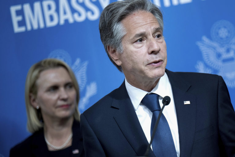Americký minister zahraničných vecí Antony Blinken po boku veľvyslankyne USA na Ukrajine Bridget Brinkovej sa prihovára zamestnancom a rodinám na veľvyslanectve USA v Kyjeve. Foto: Brendan Smialowski/Pool Photo via AP