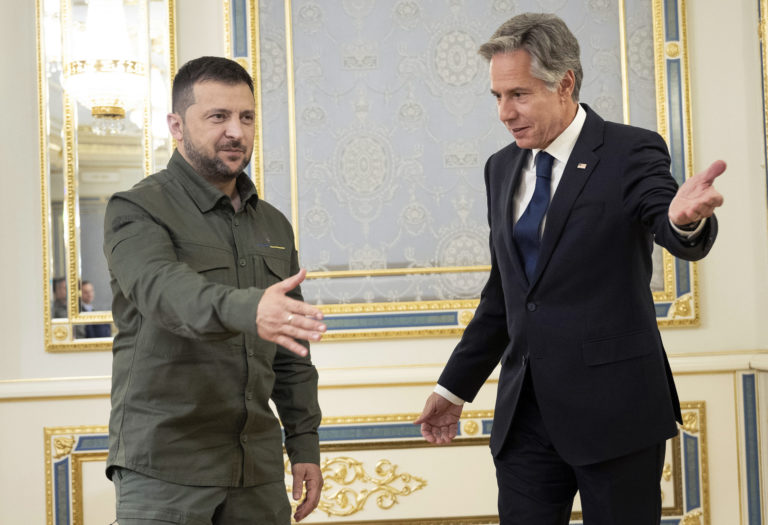 Ukrajinský prezident Volodymyr Zelenskyj víta amerického ministra zahraničných vecí Antonyho Blinkena pred stretnutím v Bankove v Kyjeve. Foto: Brendan Smialowski/Pool Photo via AP