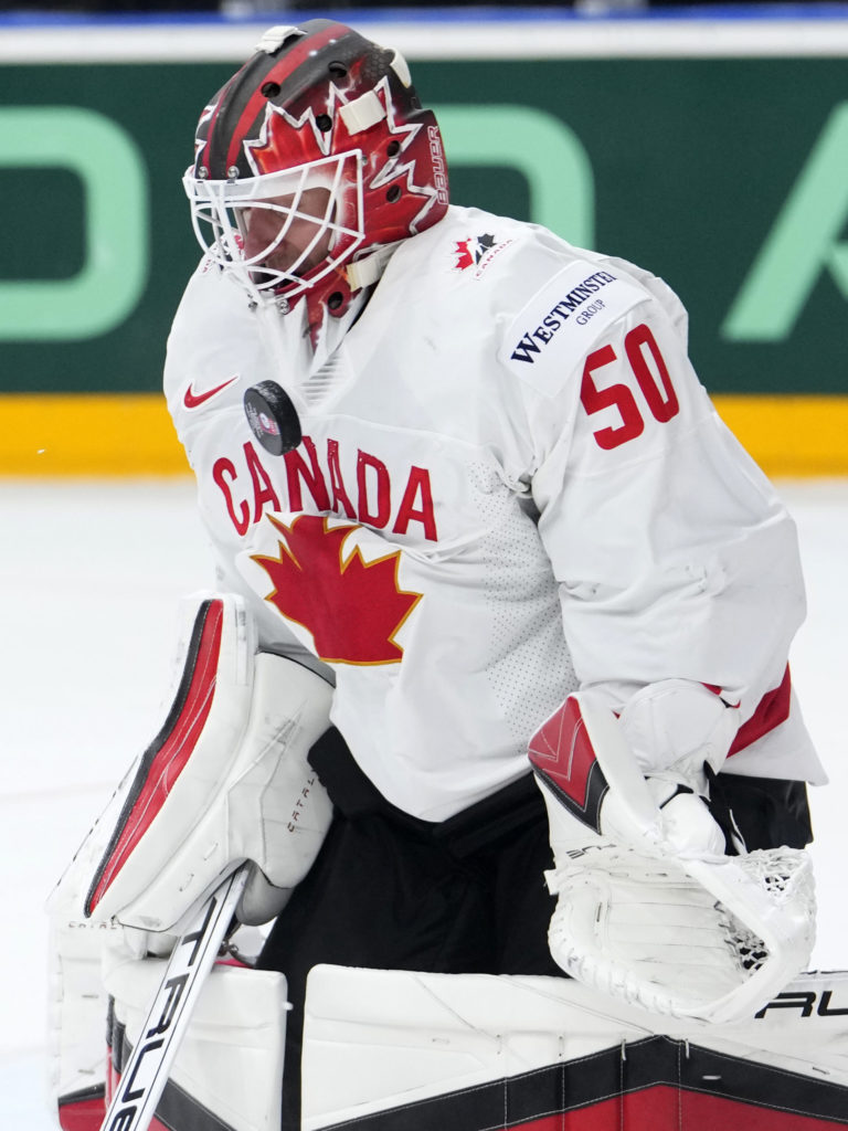 Zákrok kanadského brankára Jordana Binningtona v semifinálovom zápase proti Švajčiarsku na MS v hokeji 2024. Praha (O2 Arena), 25. máj 2024. Foto: SITA/AP.
