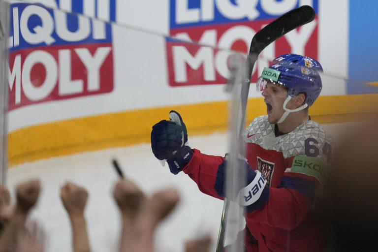 Český útočník David Kämpf sa teší z gólu v sieti Švédska v semifinálovom zápase na MS v hokeji 2024. Praha (O2 Arena), 25. máj 2024. Foto: SITA/AP.