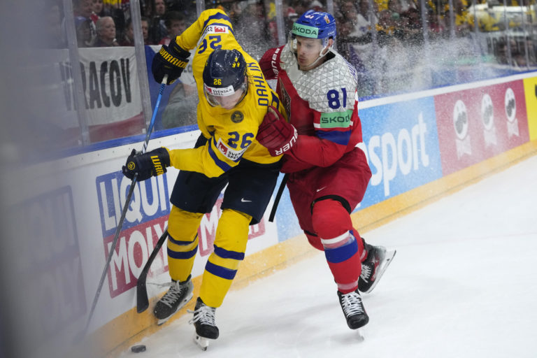 Český útočník Ondřej Kaše sa snaží obrať o puk Švéda Pontusa Holmberga v semifinálovom zápase na MS v hokeji 2024. Praha (O2 Arena), 25. máj 2024. Foto: SITA/AP.