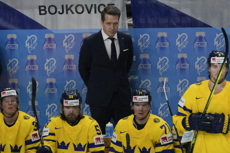 Švédsky tréner Sam Hallam počas semifinálového zápasu na MS v hokeji 2024 proti Česku. Praha (O2 Arena), 25. máj 2024. Foto: SITA/AP.