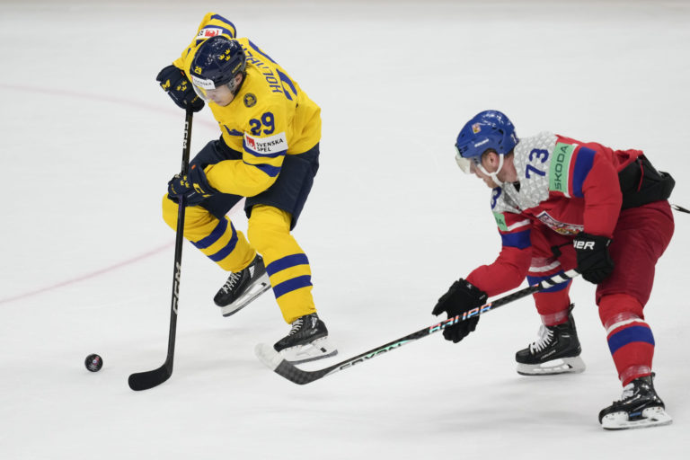 Švédsky útočník Joel Erikson Ek v súboji s Čechom Janom Ruttom v semifinálovom zápase na MS v hokeji 2024. Praha (O2 Arena), 25. máj 2024. Foto: SITA/AP.