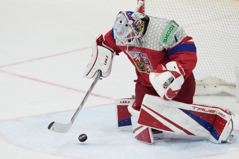 Zákrok českého brankára Lukáša Dostála v semifinálovom zápase proti Švédsku na MS v hokeji 2024. Praha (O2 Arena), 25. máj 2024. Foto: SITA/AP.
