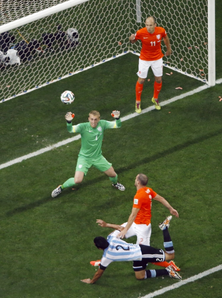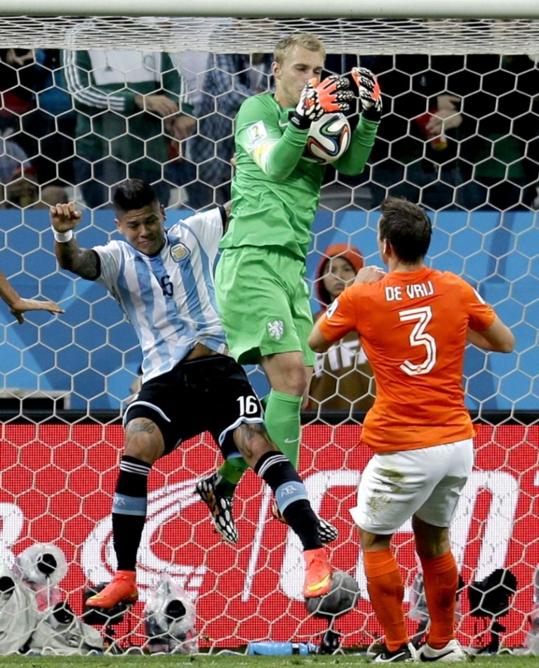 Holandský futbalista Stefan de Vrij (3) sa pozerá, ako brankár 'oranjes' Jasper Cillessen chytá loptu pred Argentínčanom Marcusom Rojom počas stredajšieho semifinálového zápasu na svetovom šampionáte v Brazílii. Foto: SITA/AP