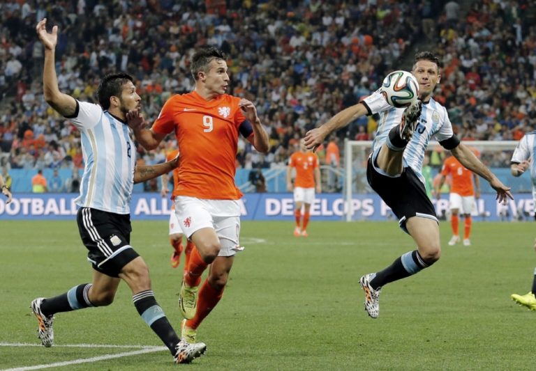 Argentínčan Ezequiel Garay (2) a holandský futbalista Robin van Persie (9) sa pozerajú, ako si Martin Demichelis spracováva loptu počas stredajšieho semifinálového zápasu na svetovom šampionáte v Brazílii. Foto: SITA/AP