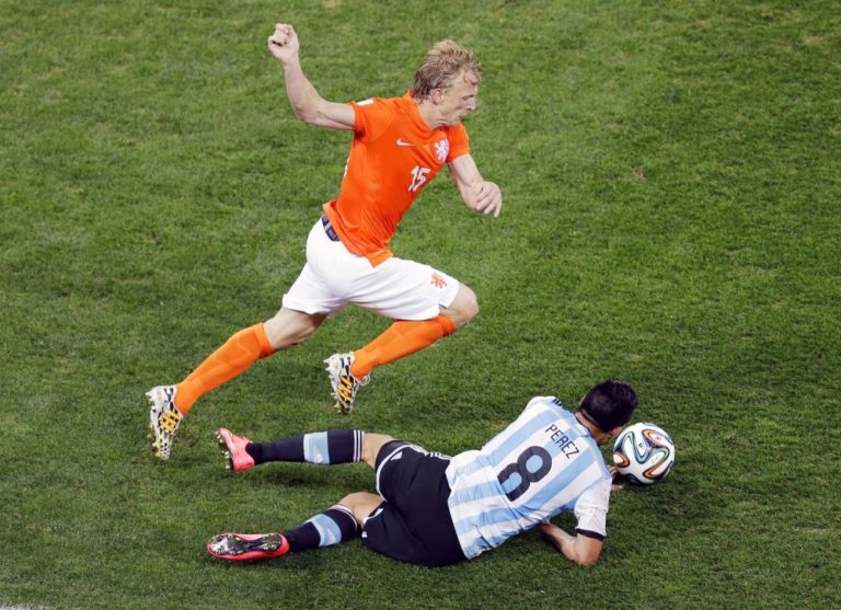 Holanďan Dirk Kuyt v súboji argentínskym futbalistom Enzom Perezom počas stredajšieho semifinálového zápasu na svetovom šampionáte v Brazílii. Foto: SITA/AP