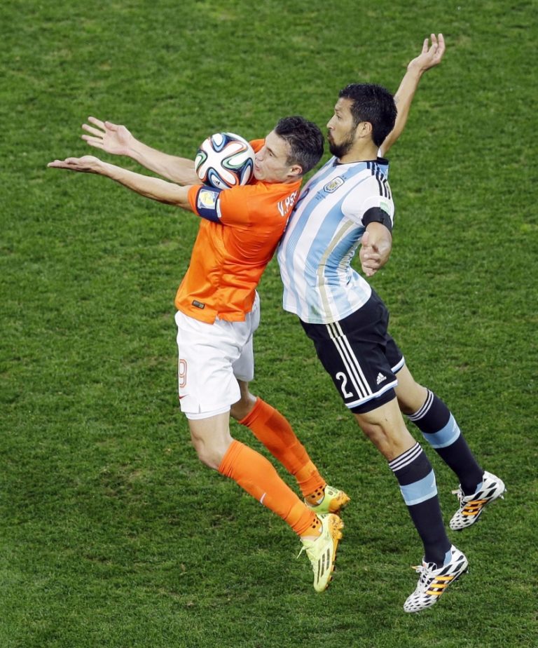 Holanďan Robin van Persie v súboji s argentínskym futbalistom Pablom Zabaletom počas stredajšieho semifinálového zápasu na svetovom šampionáte v Brazílii. Foto: SITA/AP