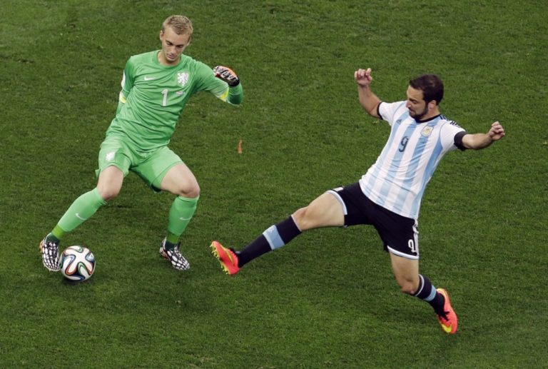 Holandský brankár Jasper Cillessen chytá loptu pred argentínskym futbalistom Gonzalom Higuaínom počas stredajšieho semifinálového zápasu na svetovom šampionáte v Brazílii. Foto: SITA/AP