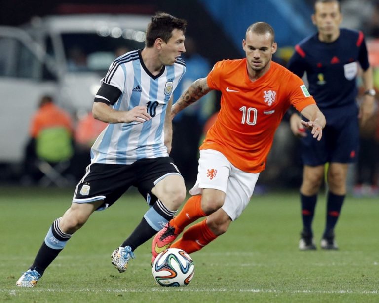 Holanďan Wesley Sneijder v súboji s argentínskym futbalistom Lionelom Messim počas stredajšieho semifinálového zápasu na svetovom šampionáte v Brazílii. Foto: SITA/AP