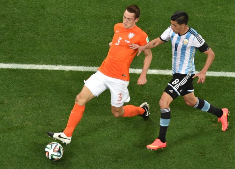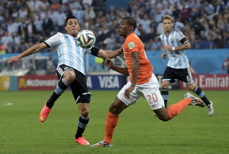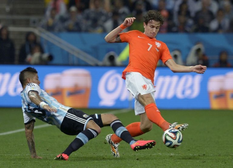 Holanďan Daryl Janmaat v súboji s argentínskym futbalistom Marcosom Rojom počas stredajšieho semifinálového zápasu na svetovom šampionáte v Brazílii. Foto: SITA/AP