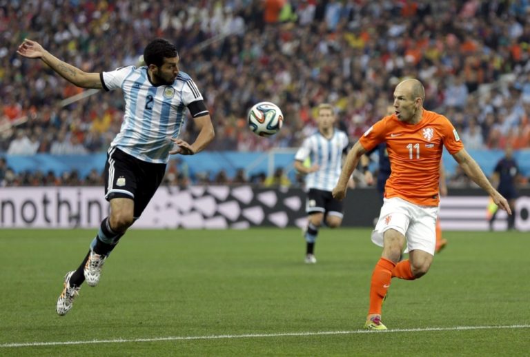 Argentíčania Pablo Zabaleta (4) a Lucas Biglia (6) v súboji s holandským futbalistom Arjenom Robbenom počas stredajšieho semifinálového zápasu na svetovom šampionáte v Brazílii. Foto: SITA/AP