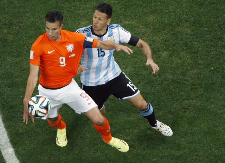 Holanďan Robin van Persie v súboji s argentínskym futbalistom Martinom Demichelisom počas stredajšieho semifinálového zápasu na svetovom šampionáte v Brazílii. Foto: SITA/AP