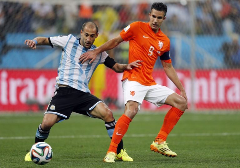 Holandský kanonier Robin van Persie si spracováva loptu pred argentínskym futbalistom Ezequielom Garayom počas stredajšieho semifinálového zápasu na svetovom šampionáte v Brazílii. Foto: SITA/AP