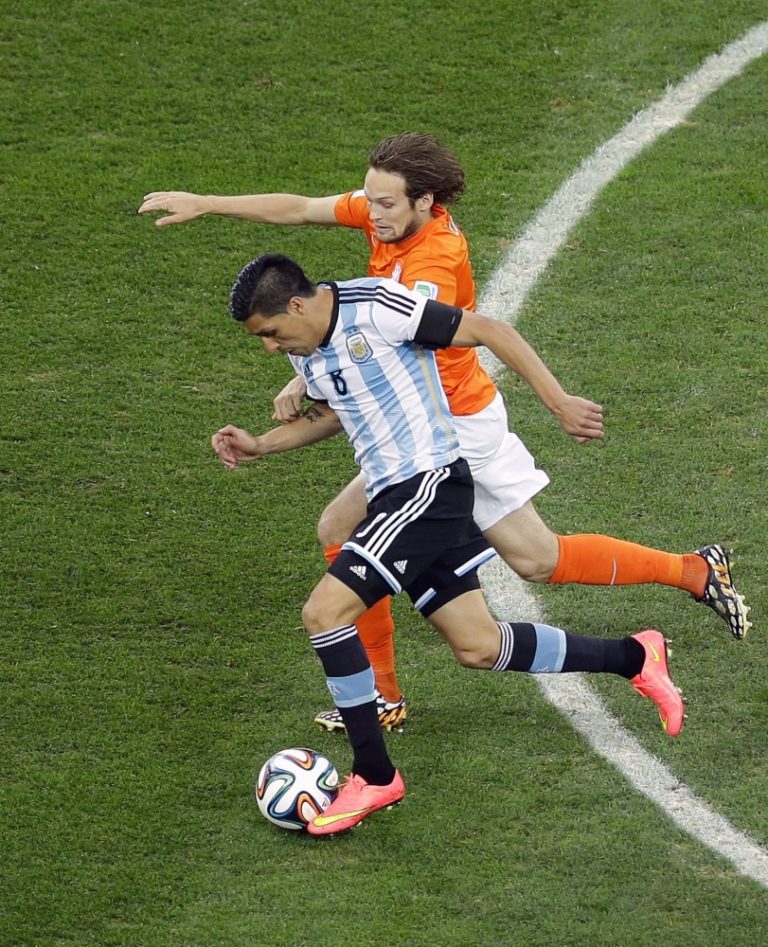 Holanďan Daley Blind v súboji s argentínskym futbalistom Enzom Perezom počas stredajšieho semifinálového zápasu na svetovom šampionáte v Brazílii. Foto: SITA/AP