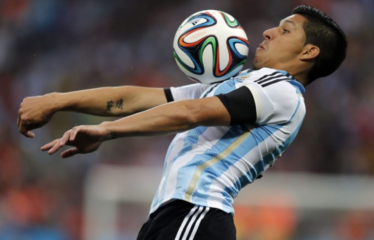 Argentínsky futbalista Enzo Perez si spracováva loptu počas stredajšieho semifinálového zápasu na svetovom šampionáte v Brazílii. Foto: SITA/AP