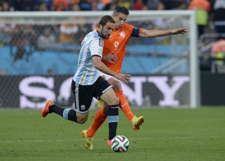Holanďan Robin van Persie v súboji s argentínskym futbalistom Gonzalom Higaínom počas stredajšieho semifinálového zápasu na svetovom šampionáte v Brazílii. Foto: SITA/AP