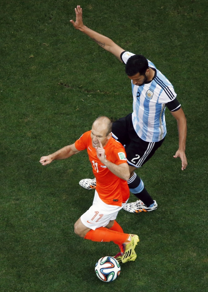 Holanďan Arjen Robben v súboji s argentínskym futbalistom Ezequielom Garayom počas stredajšieho semifinálového zápasu na svetovom šampionáte v Brazílii. Foto: SITA/AP