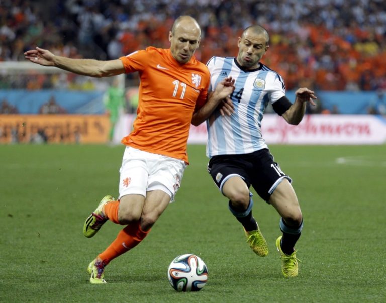 Holanďan Arjen Robben v súboji s argentínskym futbalistom Javierom Mascheranom počas stredajšieho semifinálového zápasu na svetovom šampionáte v Brazílii. Foto: SITA/AP