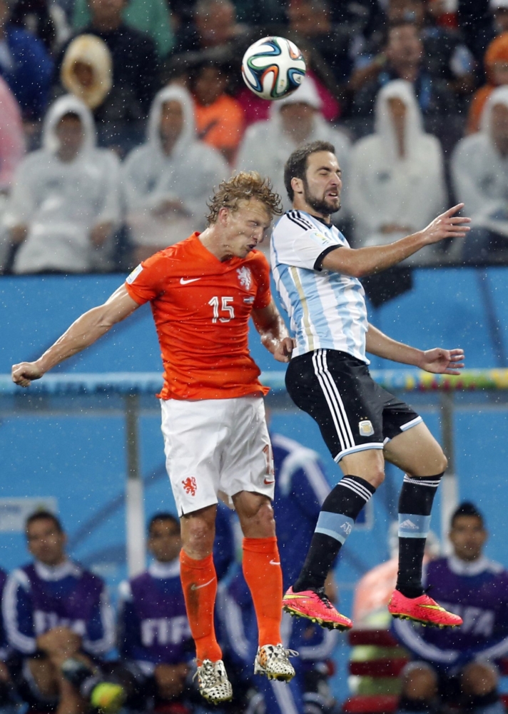 Holanďan Dirk Kuyt v súboji argentínskym futbalistom Gonzalom Higuaínom počas stredajšieho semifinálového zápasu na svetovom šampionáte v Brazílii. Foto: SITA/AP