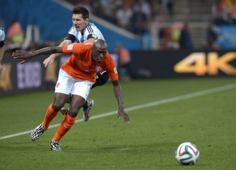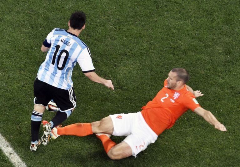 Holanďan Ron Vlaar (2) v súboji s argentínskym futbalistom Lionelom Messim počas stredajšieho semifinálového zápasu na svetovom šampionáte v Brazílii. Foto: SITA/AP