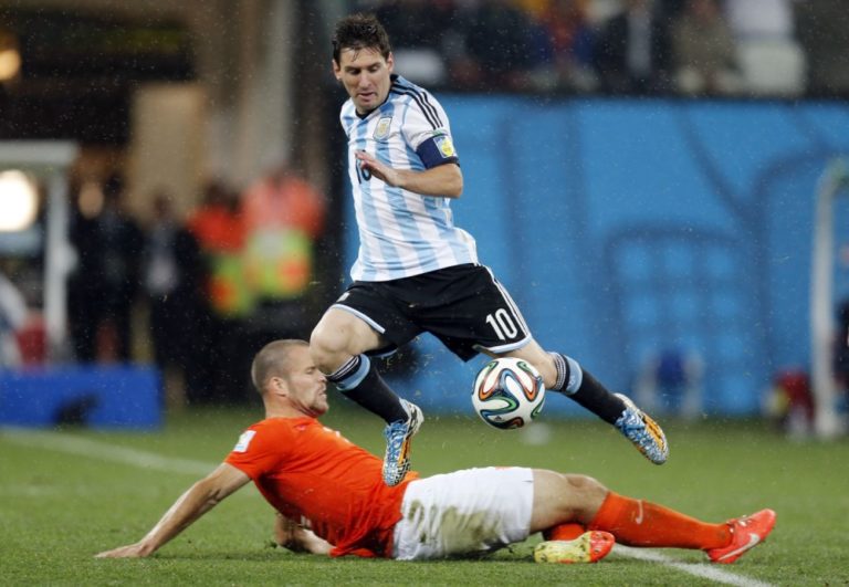 Holanďan Bruno Martins v súboji s argentínskym futbalistom Lionelom Messim počas stredajšieho semifinálového zápasu na svetovom šampionáte v Brazílii. Foto: SITA/AP
