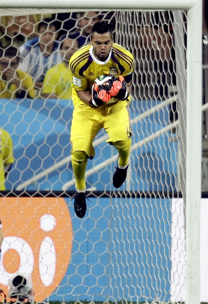 Argentínsky brankár Sergio Romero chytá loptu počas stredajšieho semifinálového zápasu na svetovom šampionáte v Brazílii. Foto: SITA/AP