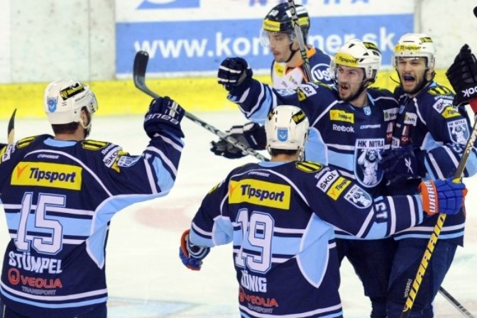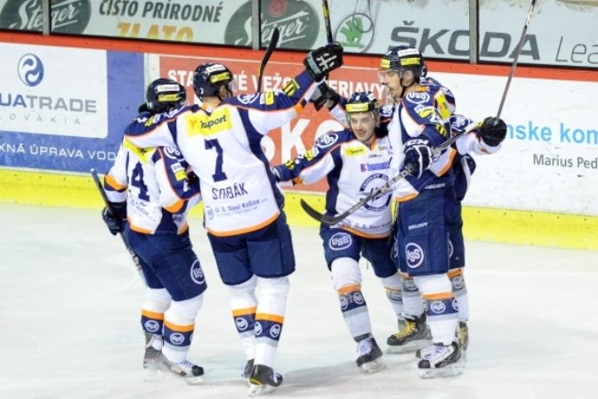 Košičania sa tešia z gólu počas prvého zápasu semifinále Slovnaft play-off Tipsport extraligy medzi HC Košice - HK Nitra . Košice, 24. marec 2013. Foto: SITA/Ivan Fleischer