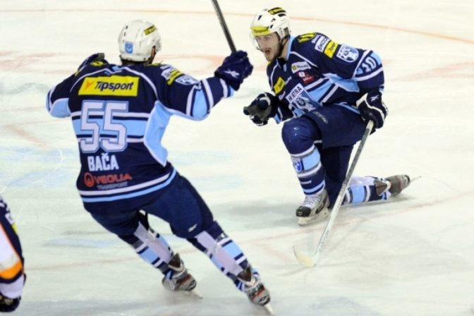 Zľava: Oliver Jokeľ z Košíc a Martin Bača z Nitry počas prvého zápasu semifinále Slovnaft play-off Tipsport extraligy medzi HC Košice - HK Nitra . Košice, 24. marec 2013. Foto: SITA/Ivan Fleischer