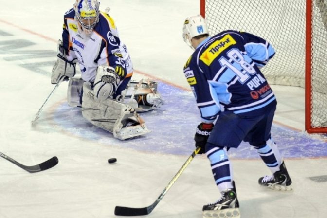 Zľava: Radovan Trefný z Nitry a Patrik Svitana z Košíc počas prvého zápasu semifinále Slovnaft play-off Tipsport extraligy medzi HC Košice - HK Nitra . Košice, 24. marec 2013. Foto: SITA/Ivan Fleischer