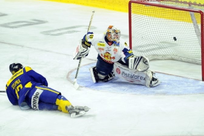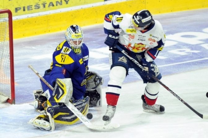 Richard Filip (vpravo) z ŠHK 37 Piešťany počas Slovnaft play-off Tipsport extraligy - semifinále - piaty zápas v sezóne 2012/2013 medzi HKM Zvolen - ŠHK 37 Piešťany. Zvolen, 30. marec 2013. Foto: SITA/Ján Viazanička