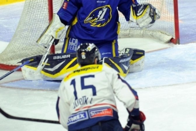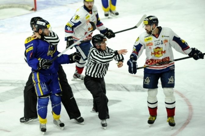 Radovan Puliš (vľavo) z HKM Zvolen počas Slovnaft play-off Tipsport extraligy - semifinále - piaty zápas v sezóne 2012/2013 medzi HKM Zvolen - ŠHK 37 Piešťany. Zvolen, 30. marec 2013. Foto: SITA/Ján Viazanička