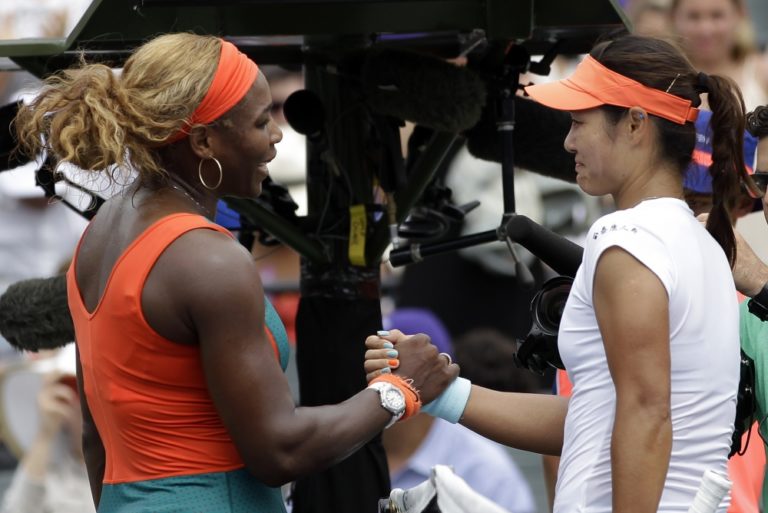 Zľava: Čínska tenista Na Li a Američanka Serena Williamsová po finálovom zápase na turnaji v Miami. Foto: SITA/AP