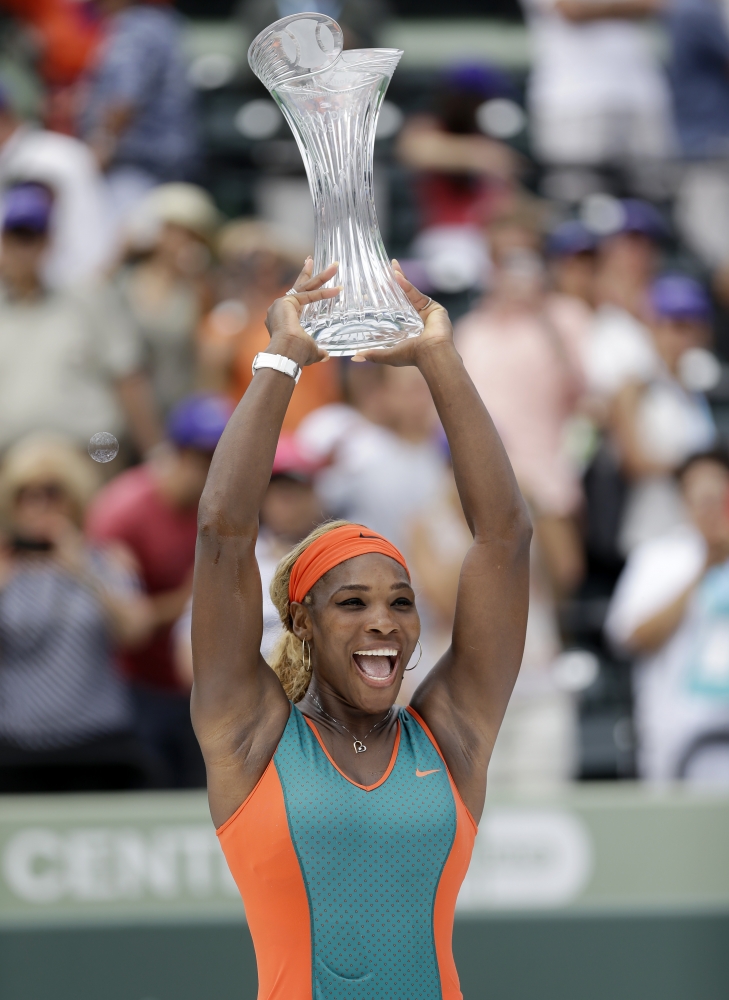 Americká tenistka Serena Williamsová s víťaznou trofejou po finálovom zápase na turnaji v Miami, v ktorom porazila Číňanku Na Li za 120 minút 7:5, 6:1. Foto: SITA/AP