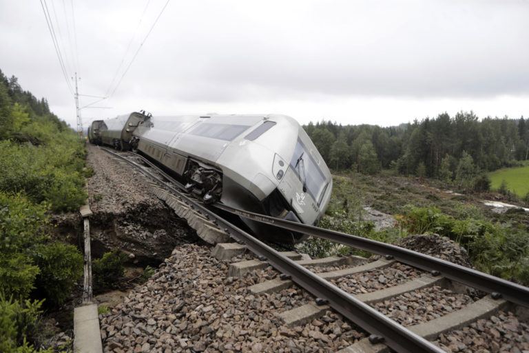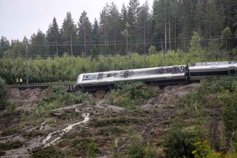 Osobný vlak so 120 cestujúcimi sa vykoľajil medzi Iggesundom a Hudiksvallom vo Švédsku. K vykoľajeniu došlo kvôli zosuvu pôdy pod koľajnicami (pondelok 7. augusta 2023). Foto: SITA/Mats Andersson/TT News Agency via AP