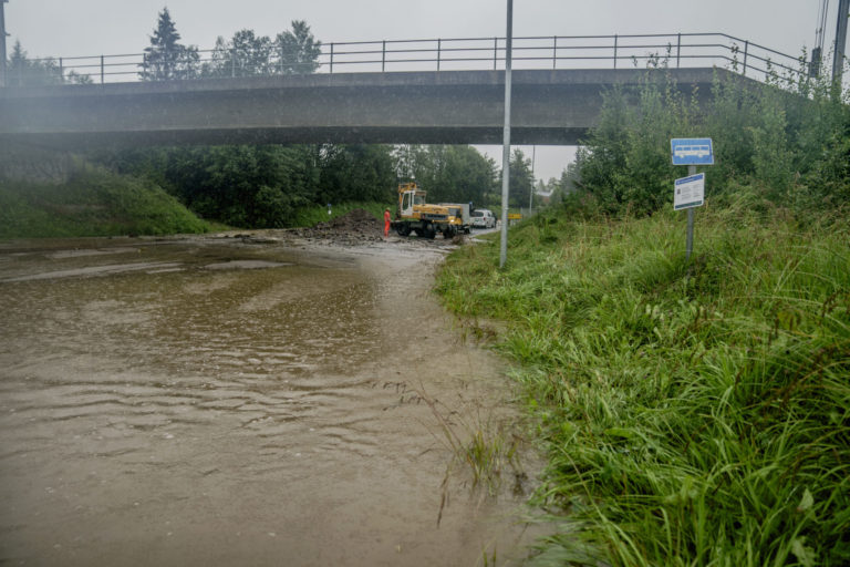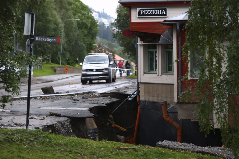 Poškodená cesta pri rieke Susa, ktorá preteká cez mesto Are, po silných dažďoch v severnom Švédsku (utorok 8. augusta 2023). Foto: SITA/Johan Axelsson/TT News Agency via AP