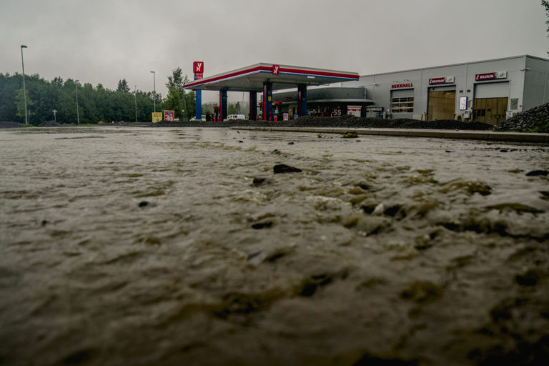Zatopené ulice v meste Reinsvoll v juhovýchodnej časti Nórska. Foto: SITA/Stian Lysberg Solum/NTB Scanpix via AP
