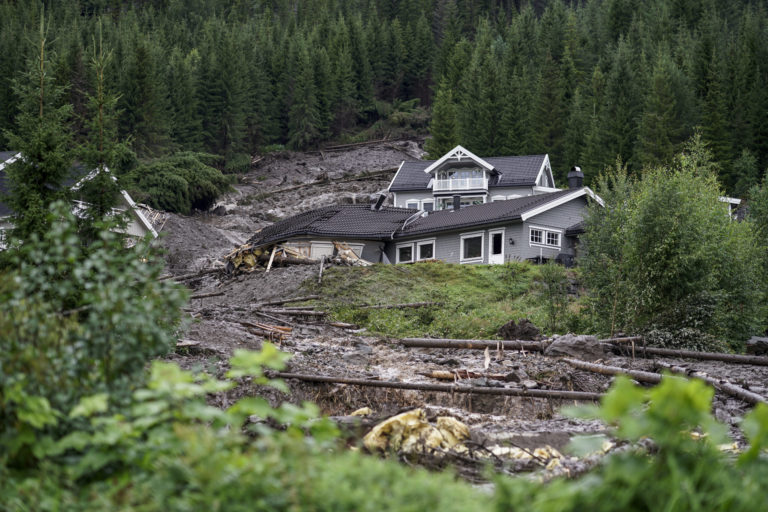 V utorok 8. augusta 2023 zasiahol zosuv bahna niekoľko obytných budov v meste Bagn v nórskom Valdres. Foto: SITA/AP