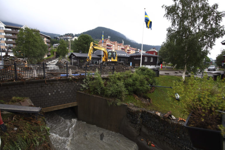 Bager odpratáva časti poškodenej cesty pri rieke Susa v meste Are v severnom Švédsku (utorok 8. augusta 2023). Foto: SITA/Johan Axelsson/TT News Agency via AP
